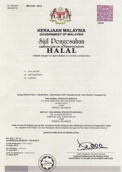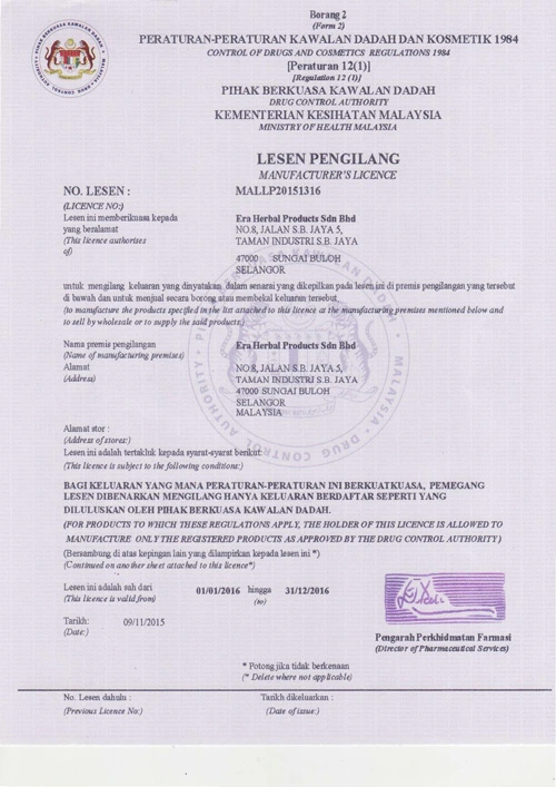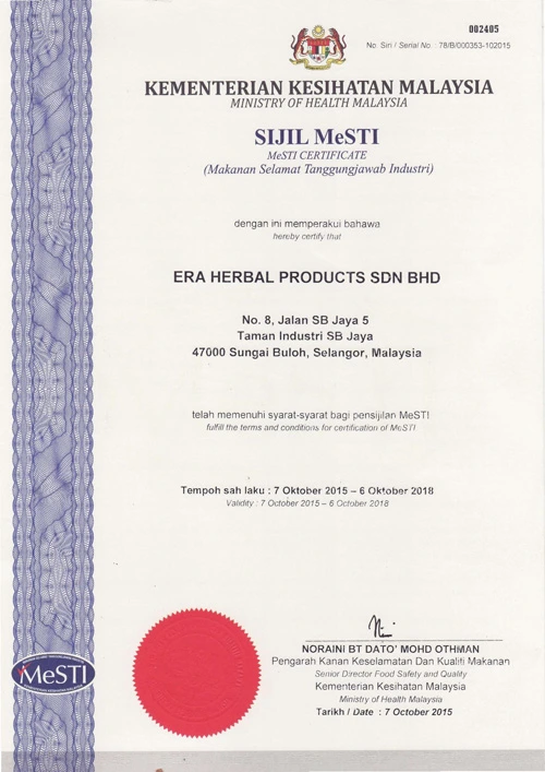 At Era Herbal, we adhere to the highest standards of safety and quality. Our products are manufactured under strict regulatory compliance and are approved by the Ministry of Health Malaysia.